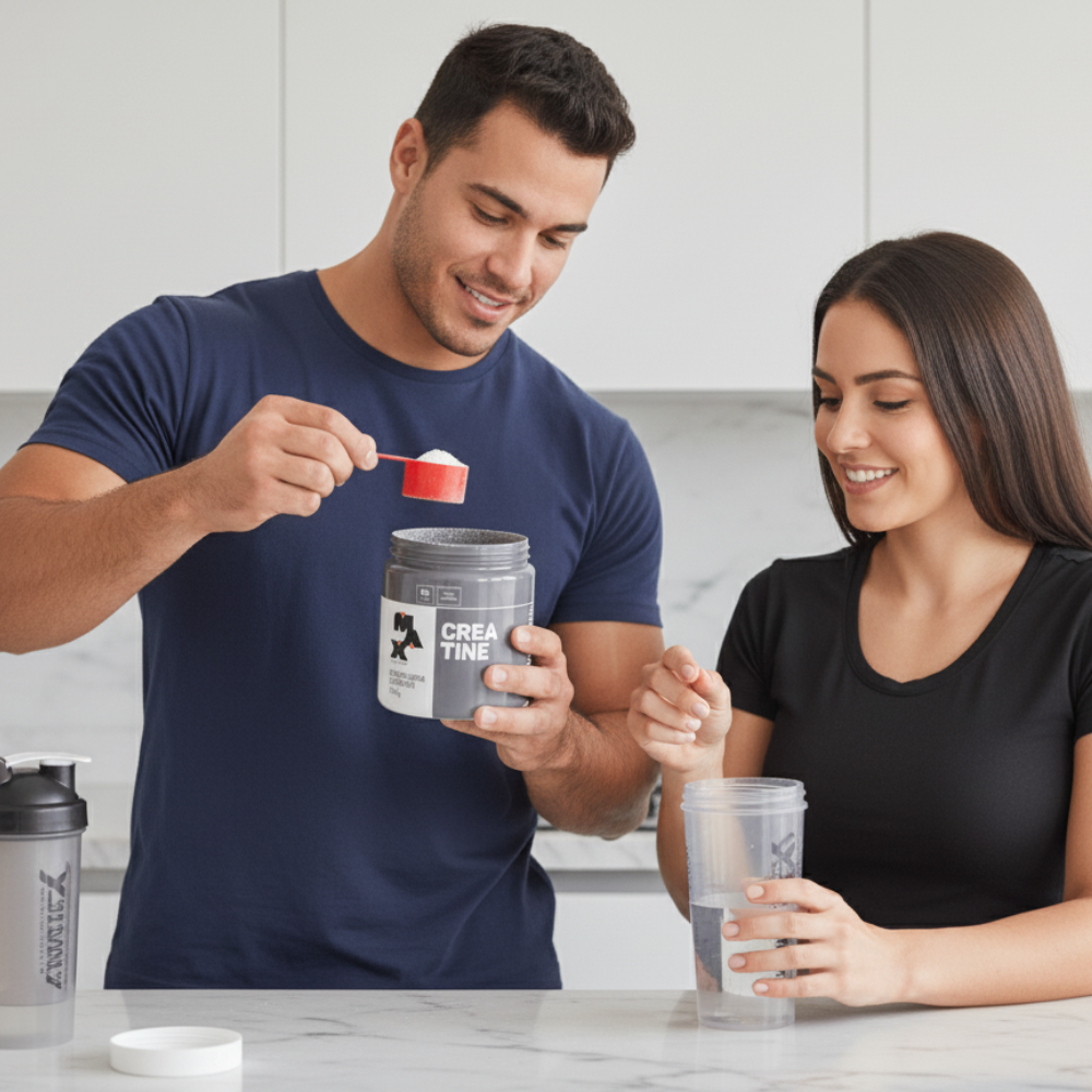 A creatina auxilia no aumento do desempenho físico durante exercícios repetidos de curta duração e alta intensidade. Formada a partir da associação de três aminoácidos de alto valor biológico (arginina, glicina e metionina), a creatina está presente naturalmente em nosso organismo, sendo que cerca de 95% do seu conteúdo é armazenado no músculo esquelético. Recomenda-se a ingestão desta substância juntamente com um carboidrato de alto índice glicêmico para facilitar o seu transporte para dentro das células musculares.