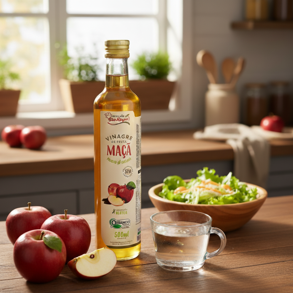 O vinagre orgânico é feito com maçãs cultivadas sem agrotóxicos, preservando melhor os nutrientes e garantindo um produto mais puro e sustentável.